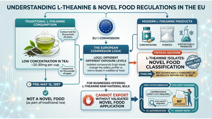 In the European regulatory framework, a “Novel Food” is defined as any food that was not consumed to a significant degree by humans in the EU before May 15, 1997. L-Theanine, despite its thousands of years of consumption through green tea, falls under this classification when it is concentrated, purified, or synthetically produced. The logic applied by the European Commission is that the exposure levels of pure L-Theanine isolates (200mg-400mg per capsule) are vastly different from the micro-doses encountered in traditional tea drinking (approx 20-30mg per cup). For businesses offering L-theanine raw material bulk, this classification means you cannot simply export without a validated Novel Food application.