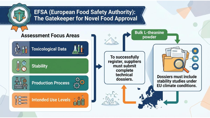 The EFSA (European Food Safety Authority) is the gatekeeper for Novel Food approval. Their assessments focus on toxicological data, stability, production process, and intended use levels. To successfully register Bulk L-theanine powder, suppliers must submit complete technical dossiers that include stability studies under EU climate conditions.