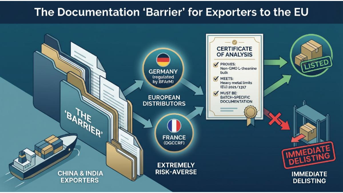 The “Barrier” for most Chinese and Indian exporters is not just the quality of the product, but the quality of the paper-trail. European distributors, particularly in Germany (regulated by BFArM) or France (DGCCRF), are extremely risk-averse. They will request certificates of analysis that prove your Non-GMO L-theanine bulk meets the heavy metal limits set by Regulation (EU) 2021/1317. Failure to provide batch-specific documentation often results in immediate delisting.
